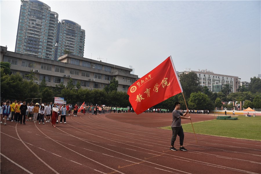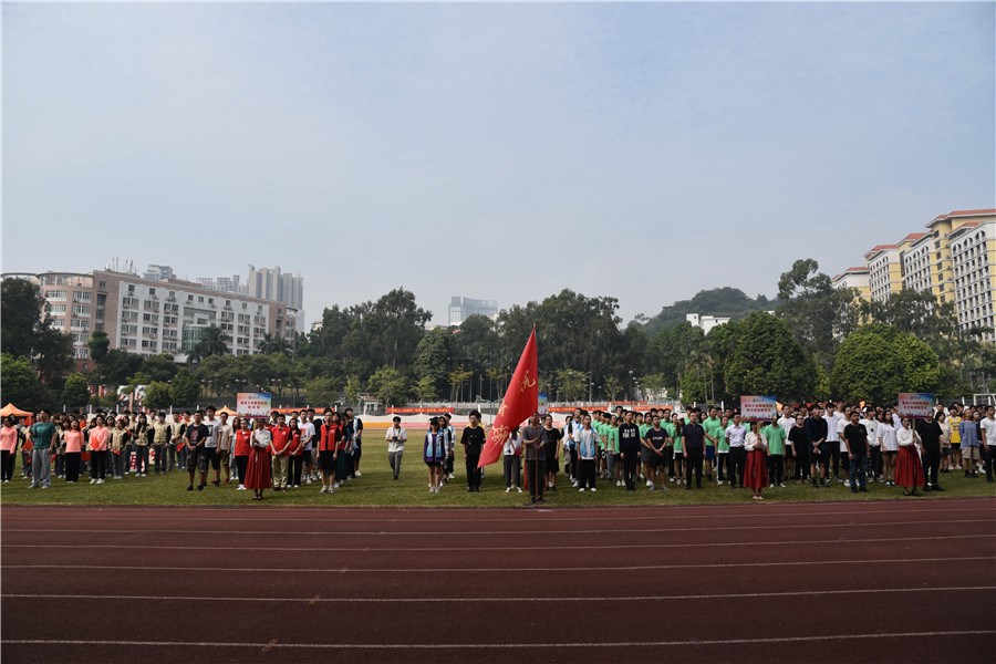 伴随着豪迈的运动员进行曲,参加运动会的裁判员和工作人员方队、校本部方队、南艺教学点方队、南方信息教学点方队、东方标准教学点方队、珠海社科教学点方队和华文教学点方队依次列队入场。